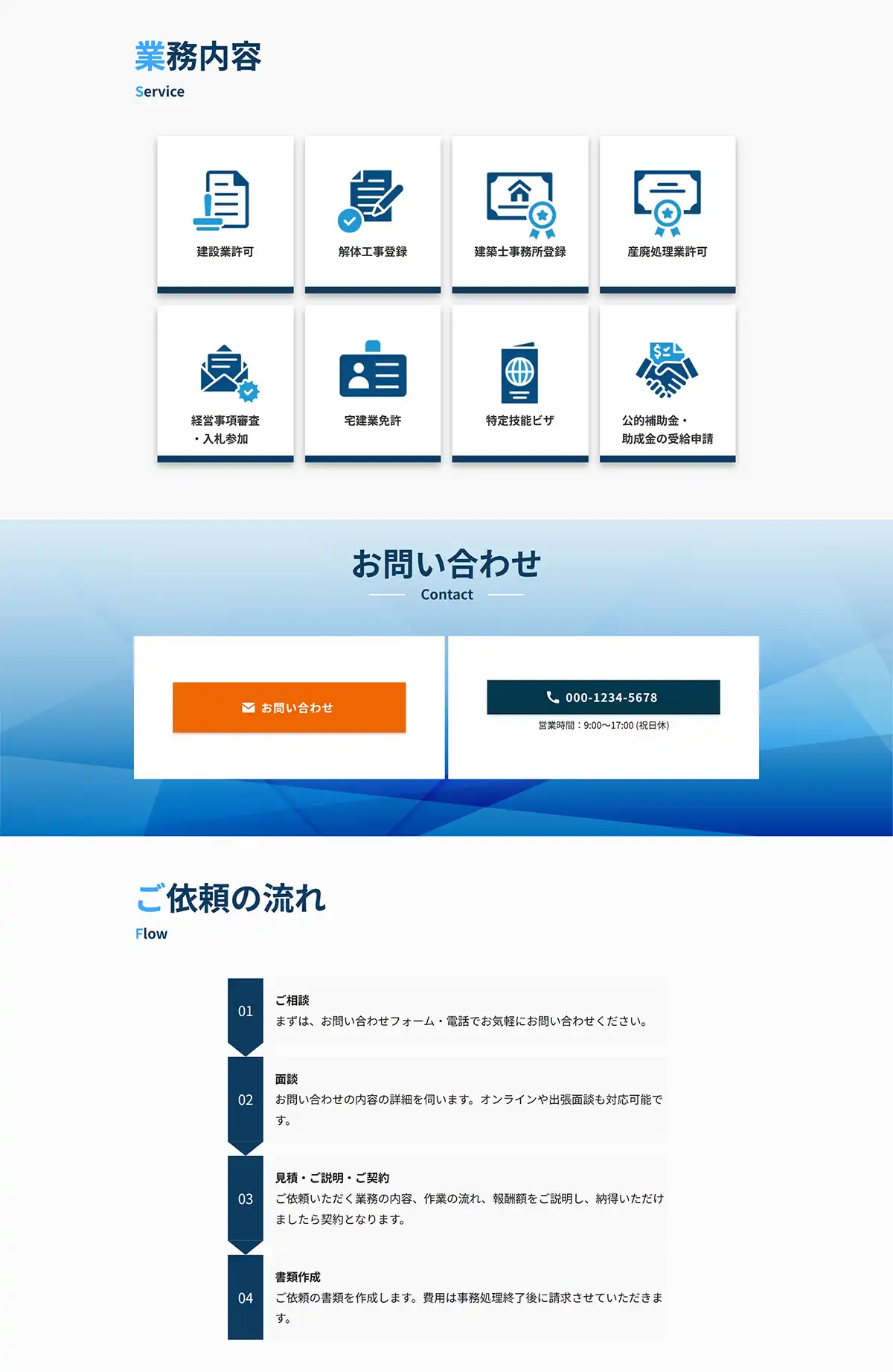 業務内容・料金・手続きの流れをシンプルに整理することで、忙しい事業者の方でも必要な情報がすぐに把握でき、お問い合わせにつながりやすい構成を意識しています。